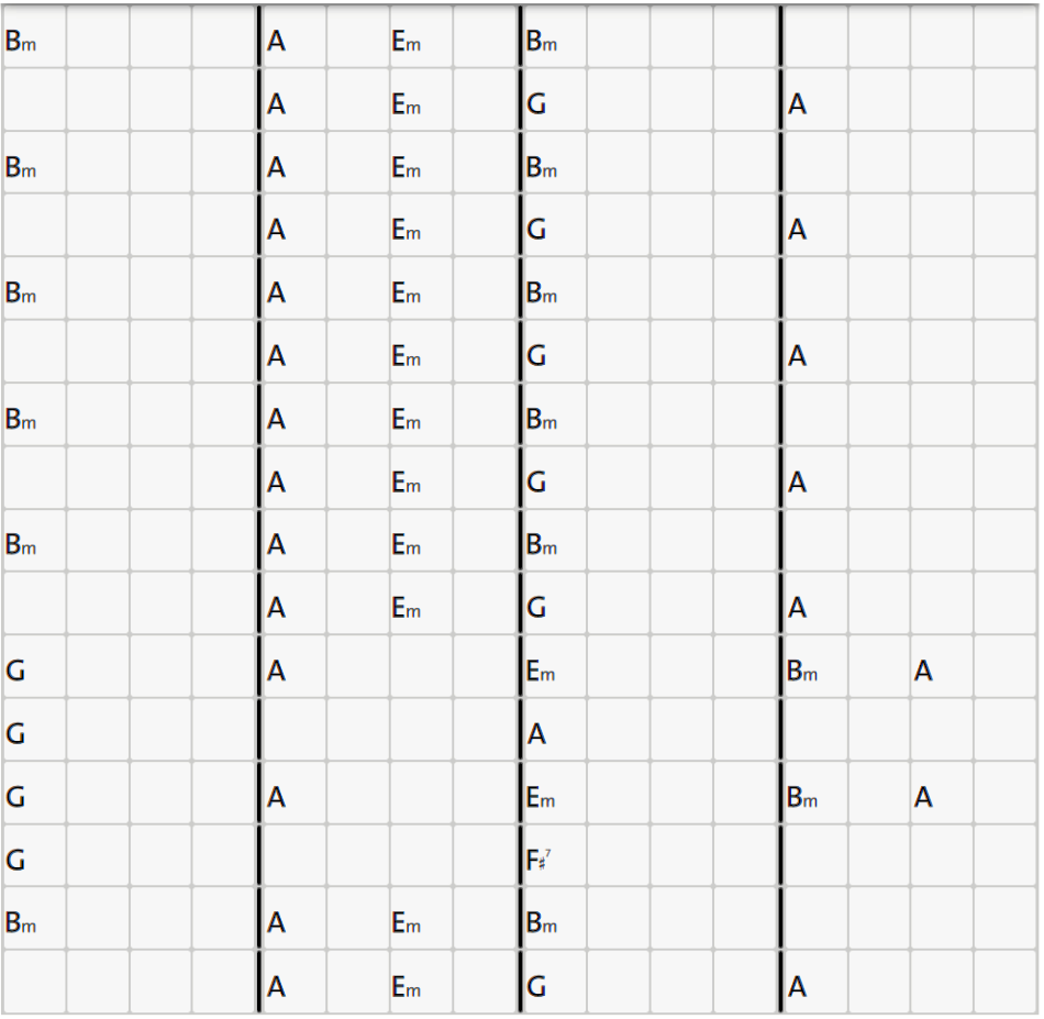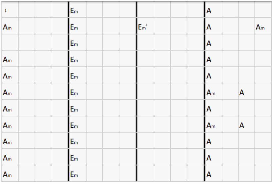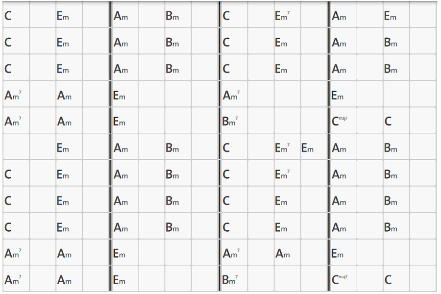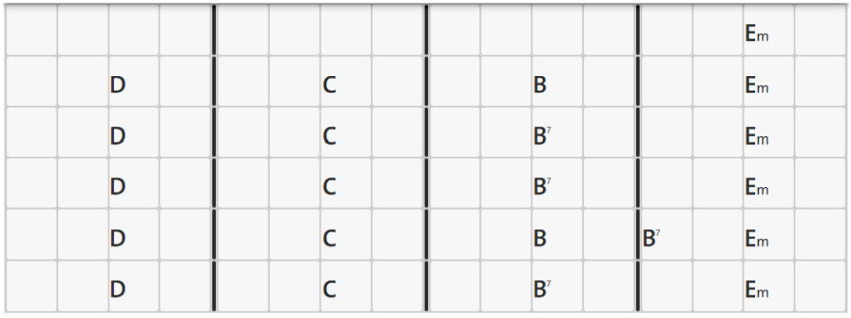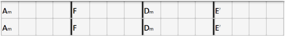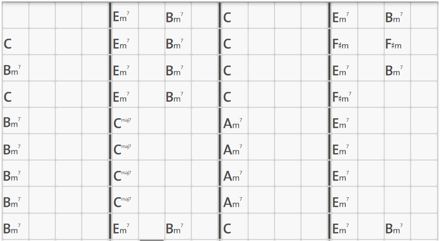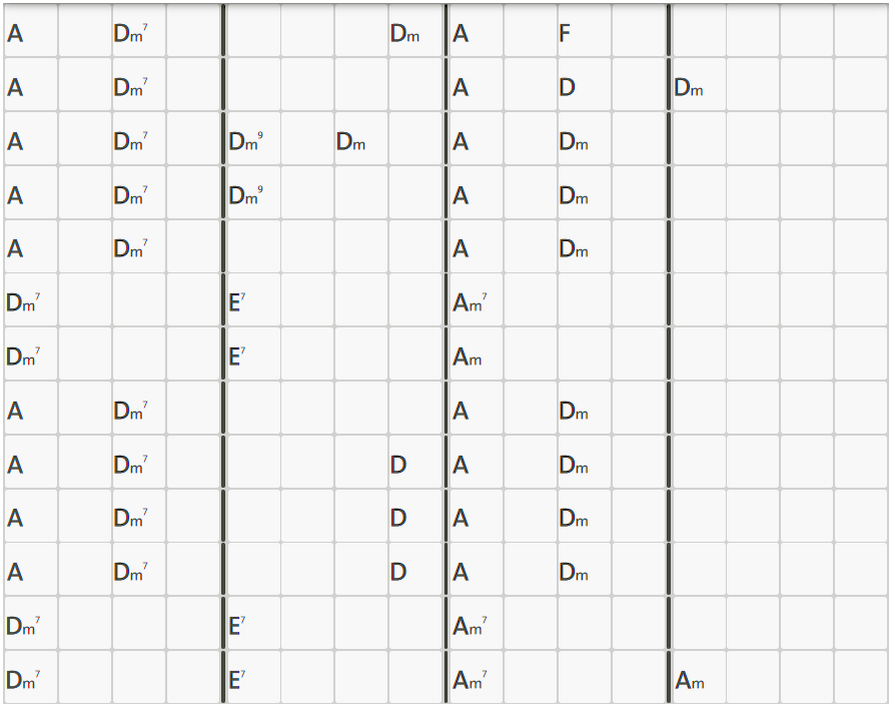 Om je goed op weg te helpen bij het meespelen met de backing tracks hebben we, in "Chordify"-vorm, een "meespeel"-schema