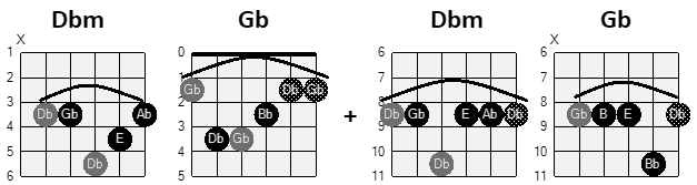 Een andere manier, en daarbij gebruik je twee barré Shapes, zie je hiernaast. Het voordeel hiervan is dat je voor de progressie van