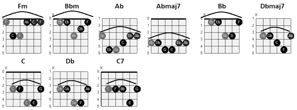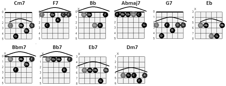 Bij veel akkoordprogressies die we bij de backing tracks hebben uitgeschreven, vind je soms meer dan 10 barré akkoorden. Heel vaak kun