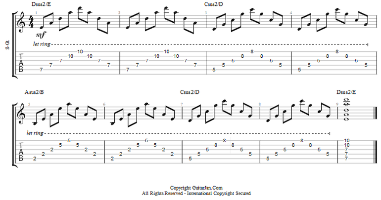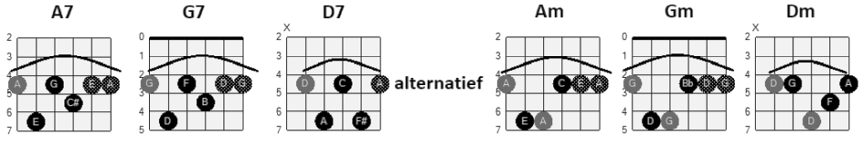via de 2de, 7de en 9de positie, weer dezelfde progressie spelen. Je kunt ook de noten op de 5de