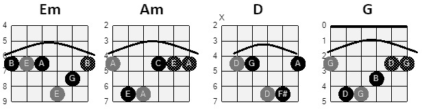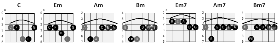 Op de gitaarhals is de positionering van deze akkoorden als volgt: