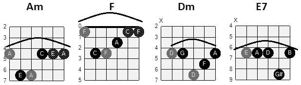 vingers nodig heeft. Uiteraard wordt de wijsvinger in alle gevallen gebruikt om de barré te maken. Je zou de akkoordprogressie van hierboven ook