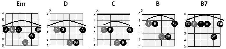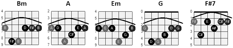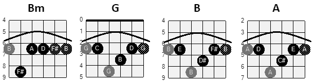 F♯ op de 2de positie staat. De voor de akkoordprogressie I - IV - V benodigde B mineur kun je ook op de 2de