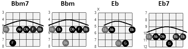 We geven je de verkorte (of vereenvoudigde) barré Shapes bij de eerste twee progressie-voorbeelden die we hiervoor hebben laten zien.