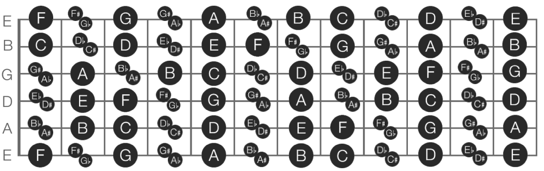 Het is belangrijk dat je in ieder geval de notennamen kent op de 6de snaar (de lage-E snaar), en de 5de snaar (de A snaar).