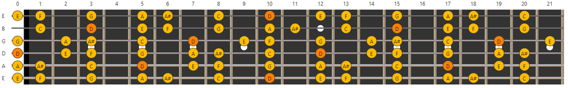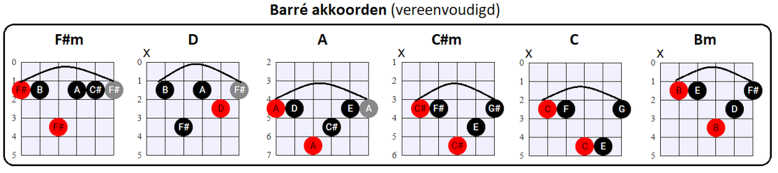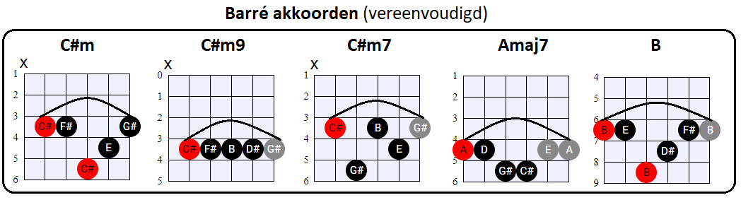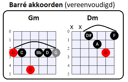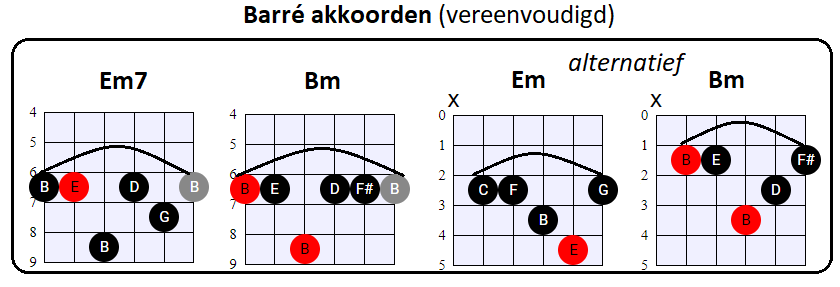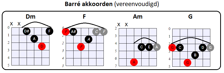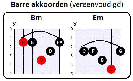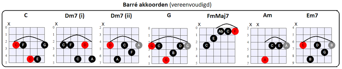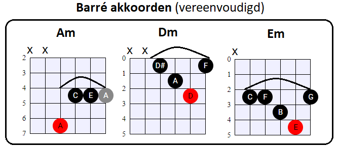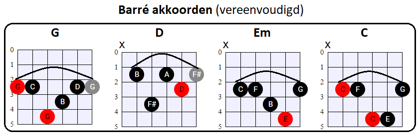 vooral de tonen op de G, B en (hoge) E snaar voor zijn rekening neemt. En dat is nou net wat wij met de vereenvoudigde Barré akkoorden