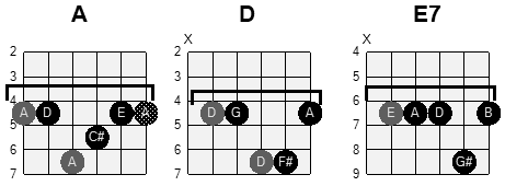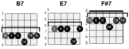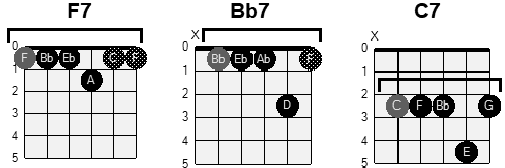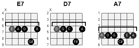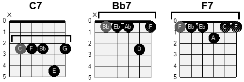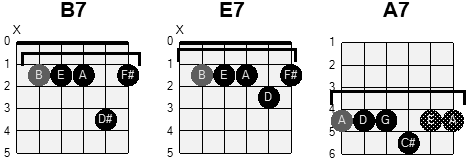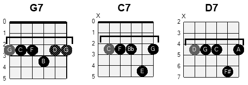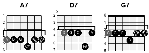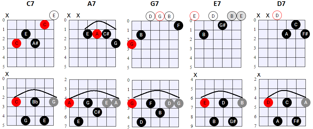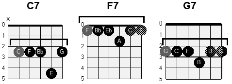 Blues wordt veel gespeeld over septiem (7) akkoorden, en de belangrijkste daarvan zijn de C7, A7, G7, E7 en D7. Niet vreemd, deze volgorde