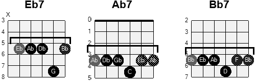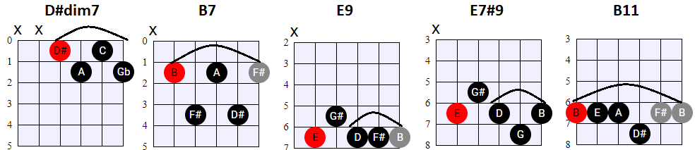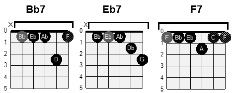 Veelgebruikte andere akkoordvormen in Blues/Bluesrock zijn: