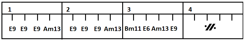 zogeheten 12-Bar Blues en heeft in de twaalf maten de volgende akkoordprogressie (we geven de maten en de akkoorden):