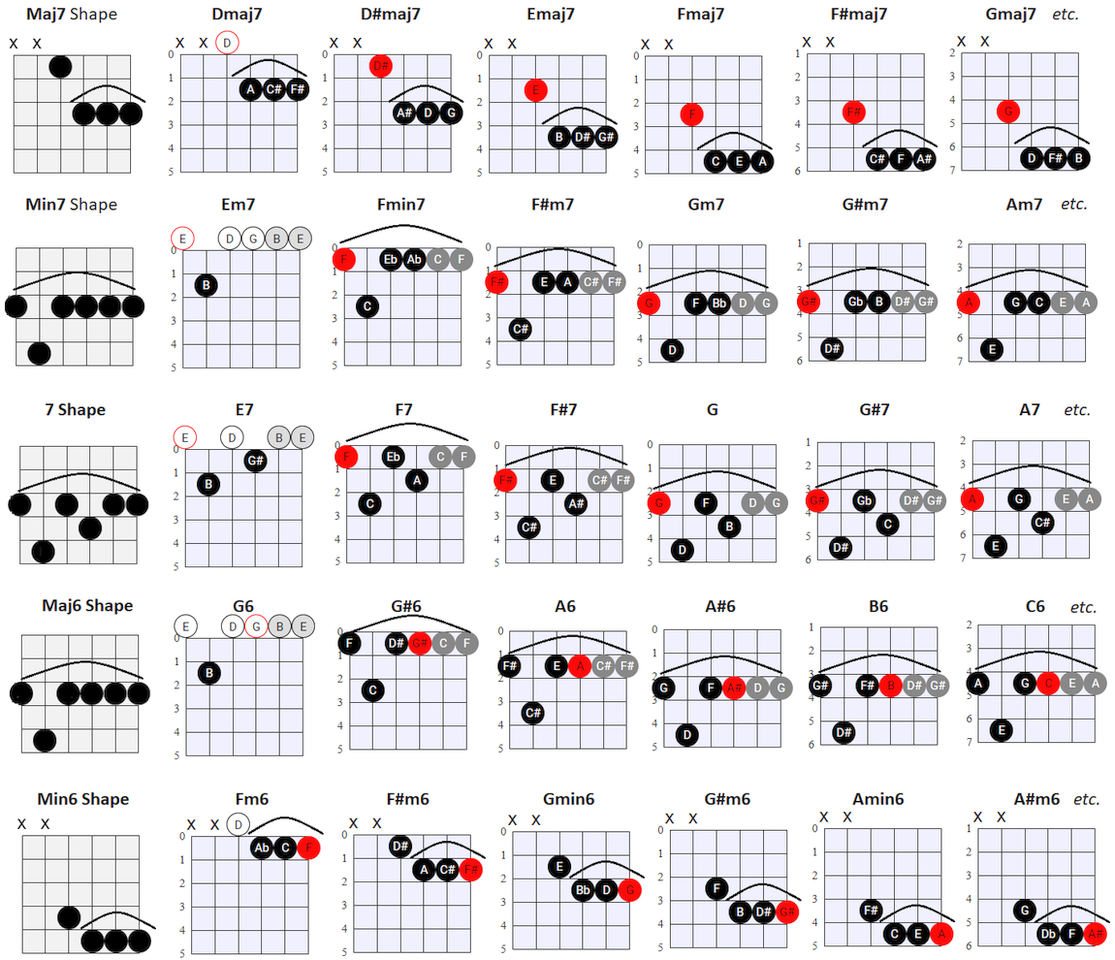 stappen die de deur zullen openen naar het spelen van jazzmuziek. Als je bekend met barré akkoorden, kun je weer in Shapes gaan denken, als