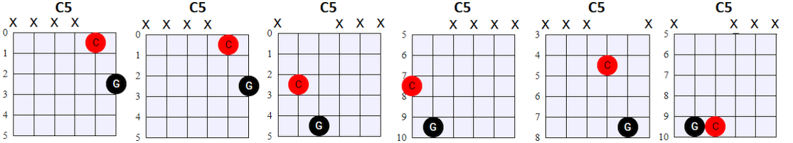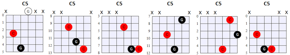 Onderstaand zie je een voorbeeld van 6 verschillende posities op de gitaarhals waar je een C power chord (C5) kunt vinden. Er zijn nog veel