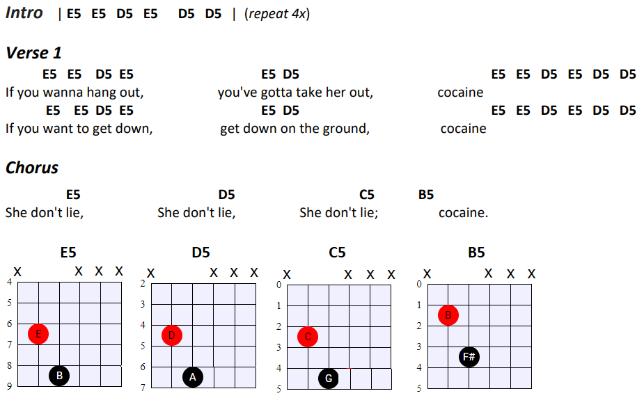Een voorbeeld van het gebruik van power chords vind je bijvoorbeeld in de song "Cocaine" van J.J. Cale/Eric Clapton.