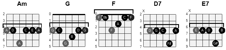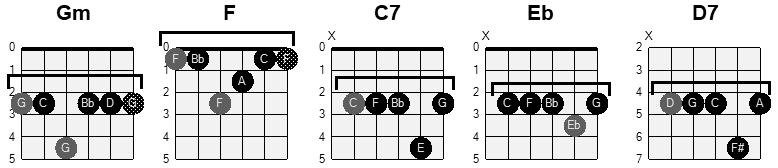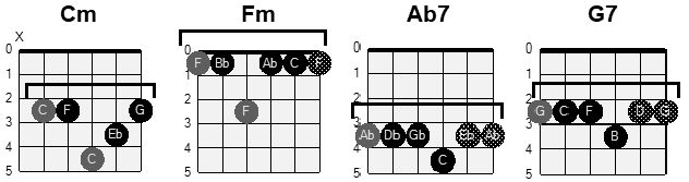 hebben we in een aantal stijlsoorten en toonsoorten een aantal voorbeeld-akoordenprogressies bedacht. De akkoorden zijn voornamelijk in barré-vorm,