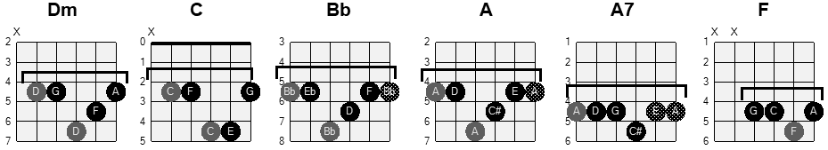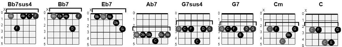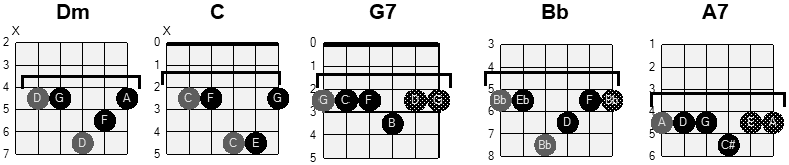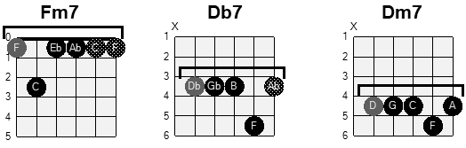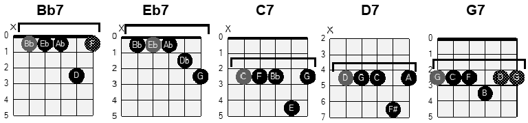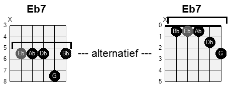 Hieronder de genoemde septiemakkoorden in de open en de barré versie: