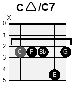 de akkoordnamen anders zijn dan we voor de funky akkoordprogressies gebruiken. Dat komt omdat we van alle akkoorden de bovenste twee snaren,