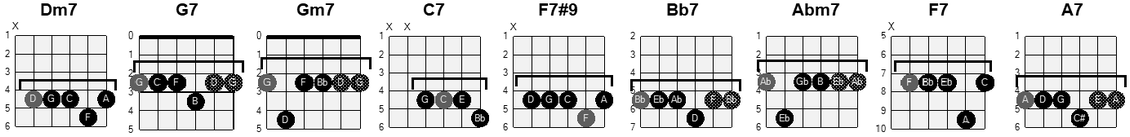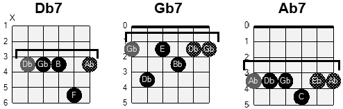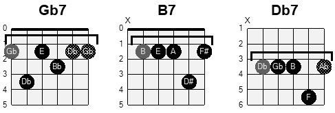 Je kunt deze akkoorden overigens daadwerkelijk met elkaar gebruiken (één barré Shape waarmee je een compleet funknummer
