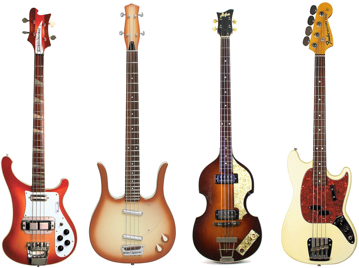 Hierboven zie je van links naar rechts de Rickenbacker 4000 (1961), Danelectro Longhorn (1958), Höffner Violin Bass (1965), en de