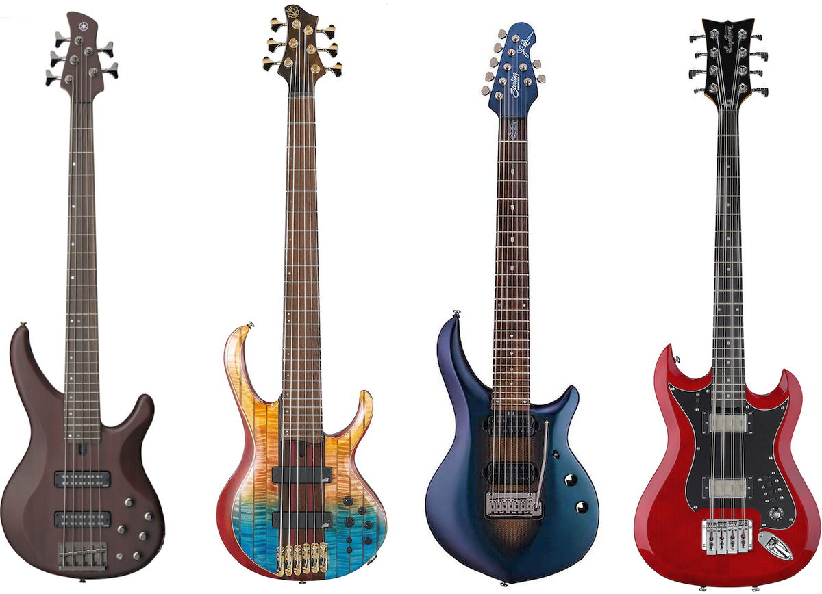 Hierboven zie je van links naar rechts een 5-snarige Yamaha TRBX500, een 6-snarige Ibanez BTB1936, een 7-snarige Sterling by Music Man